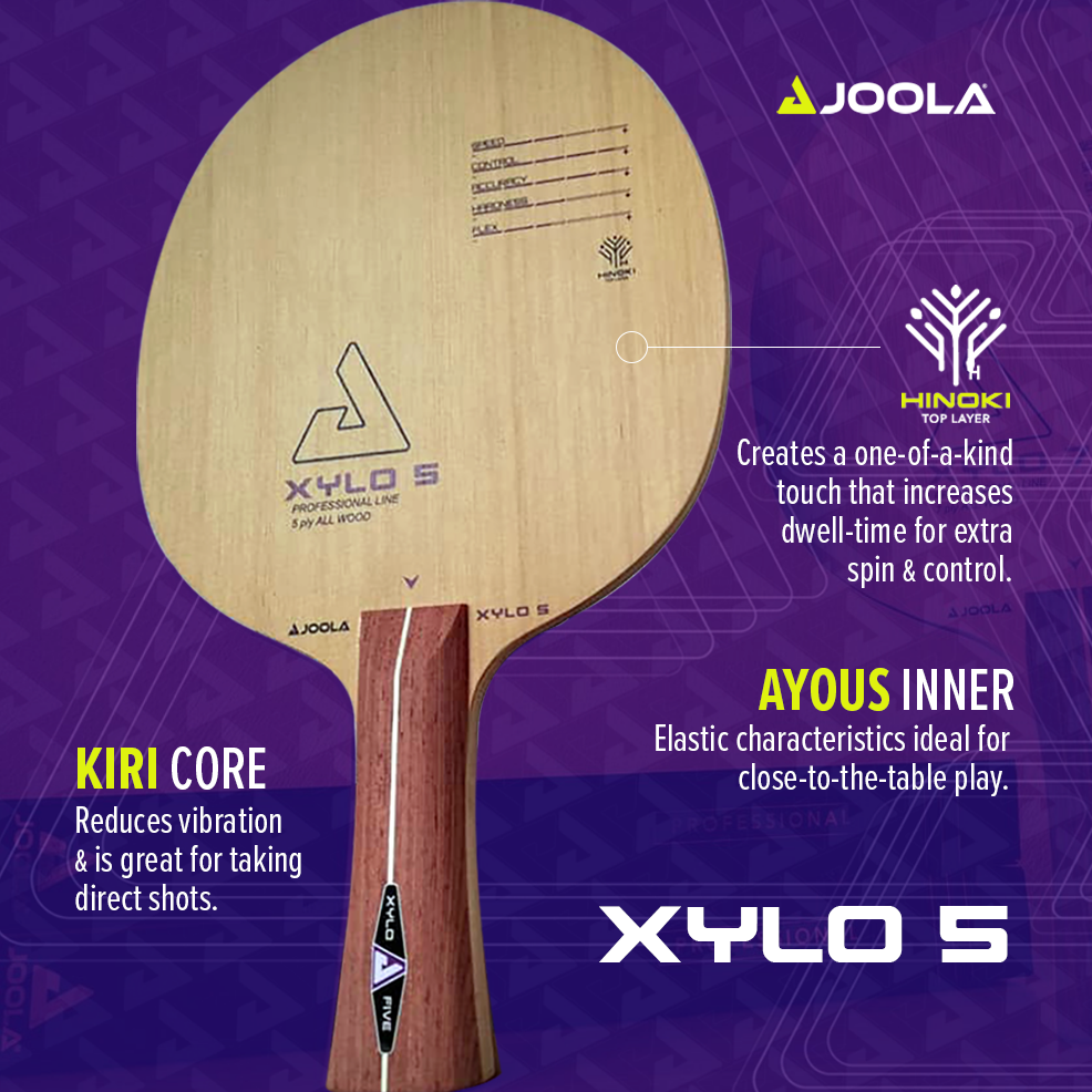 HINOKI ไม้ญี่ปุ่นระดับพรีเมียมที่เป็นที่ต้องการอย่างสูง มักได้รับการยอมรับไม้นี้มีลักษณะเฉพาะที่นุ่มพร้อมการกระดอนเล็กน้อย และสร้างสัมผัสที่ไม่เหมือนใครซึ่งเพิ่มเวลาพักสำหรับการหมุนและการควบคุมเป็นพิเศษ ใน JOOLA Xylo 5 แผ่นไม้อัด HINOKI โดยใช้เทคนิคการทำความร้อนที่เป็นนวัตกรรมใหม่เพื่อเพิ่มความเร็วโดยการเพิ่มความแข็งของไม้AYOUS ชั้นในมีถิ่นกำเนิดในแอฟริกา AYOUS ชดเชยน้ำหนักของแผ่นไม้อัดชั้นนอกของ Hinoki ได้อย่างสมบูรณ์แบบด้วยความเบาและมีอัตราส่วนความแข็งแรงต่อน้ำหนักที่ดีเยี่ยม ด้วยรูพรุนที่ใหญ่ขึ้นตามธรรมชาติของไม้ ไม้จึงคงลักษณะยืดหยุ่นได้ จึงเหมาะอย่างยิ่งสำหรับการเล่นใกล้โต๊ะคีรีคอร์KIRI ทนทานและแข็งแต่น้ำหนักเบา ใช้เป็นแผ่นไม้อัดแกนกลางและเป็นกุญแจสำคัญในการรักษาสมดุลโดยรวมของใบมีด ไม้ที่แข็งขึ้นนี้ช่วยลดแรงสั่นสะเทือนและเหมาะอย่างยิ่งสำหรับการถ่ายภาพโดยตรง